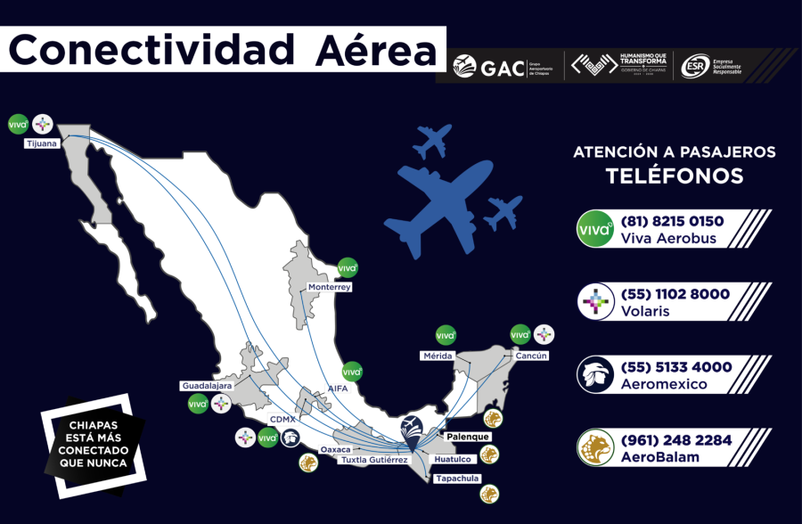 En el Aeropuerto Internacional Ángel Albino Corzo, operan 4 líneas aéreas. La compra de boletos aéreos, reservaciones o confirmaciones de reservaciones debe hacerse directamente con la aerolínea, para obtener más información puede visitar la página oficial dando clic sobre cada logotipo.